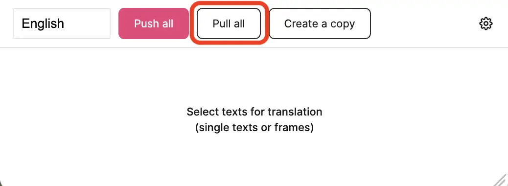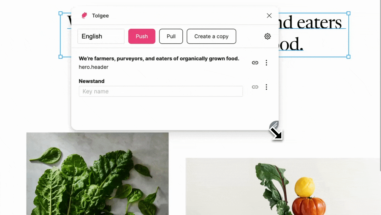 If you are working on a Figma file that already has the keys added on Tolgee, you can select the whole frame or just the text string and click “Pull” in the Tolgee plugin window to update them.